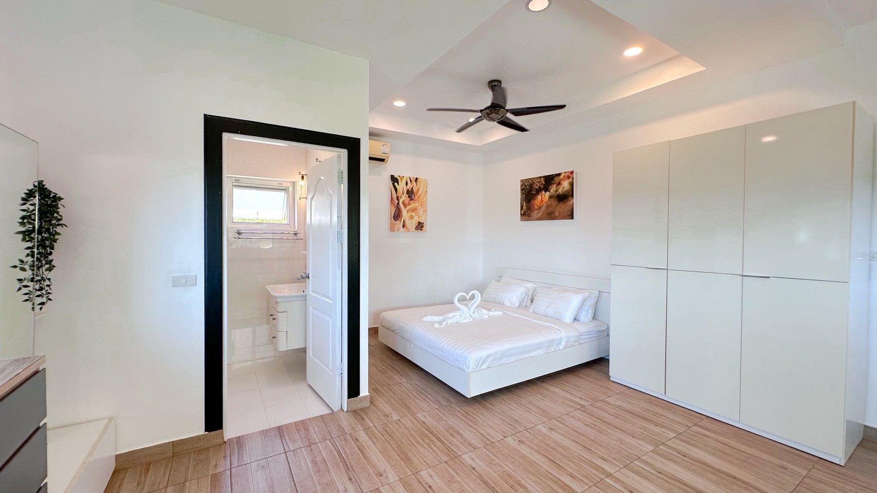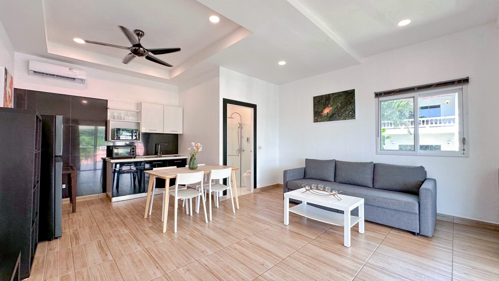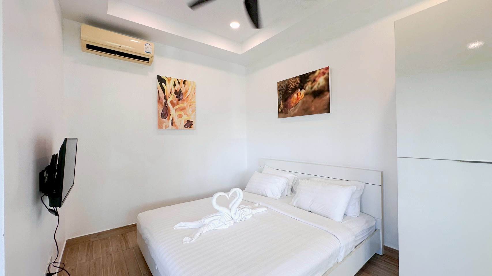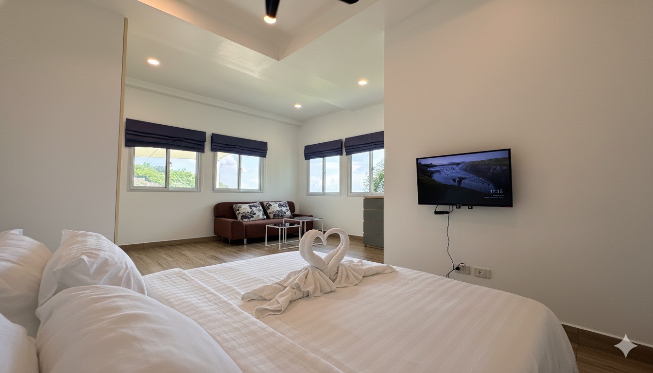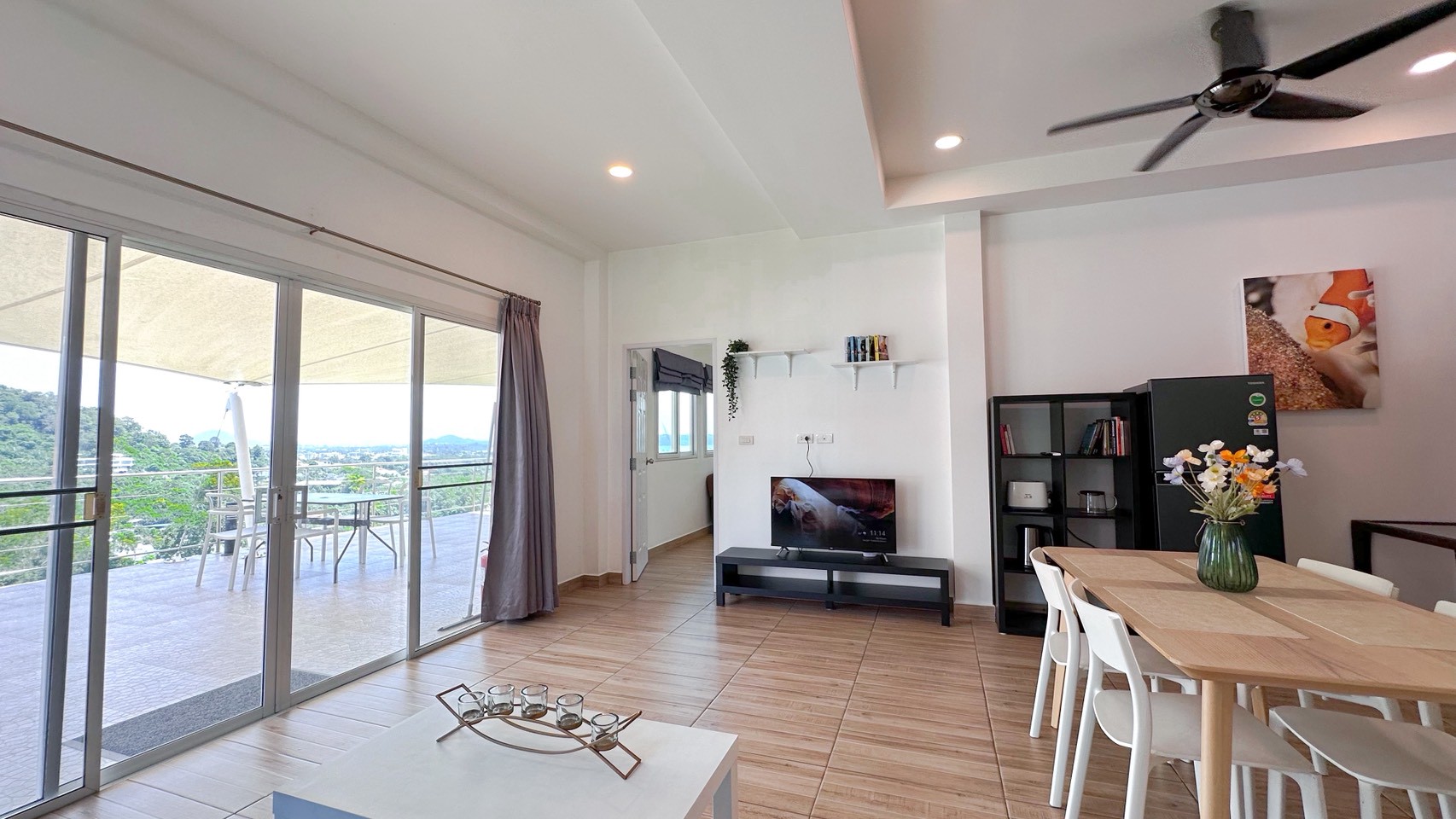 Experience the luxury of a 110-square-meter one-bedroom apartment on the second floor, boasting breathtaking 180-degree panoramic views of the mountains and sea. This unit features a separate bedroom and living room, two en-suite bathrooms, a dining table for four, and a fully-equipped kitchen. The apartment also offers an exceptionally spacious private balcony off the living area, making it perfect for couples or families seeking a serene and picturesque retreat.