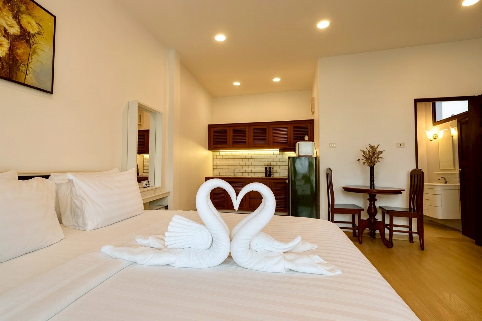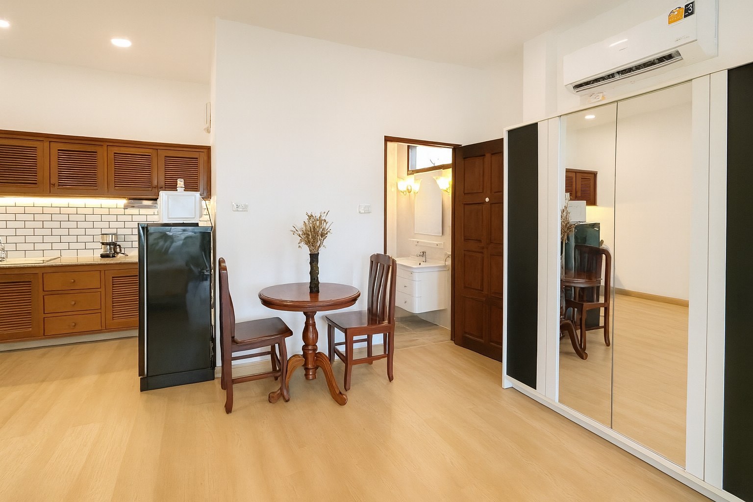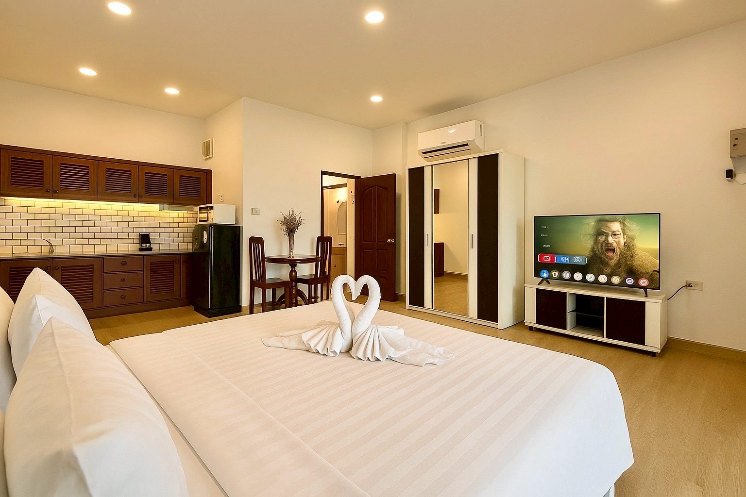 Discover a 42-square-meter studio apartment on the first floor, featuring a grassy area and garden in front of the unit. Enjoy sea views from the bedroom and the beauty of sunrise each morning. This apartment includes a spacious private balcony, an en-suite bathroom, a dining table for two, and a fully-equipped kitchen.