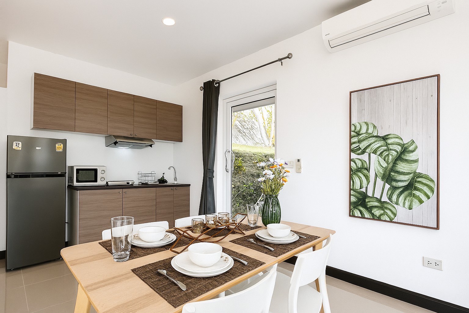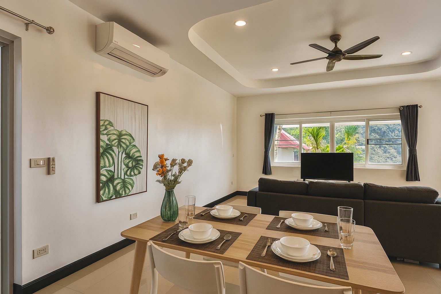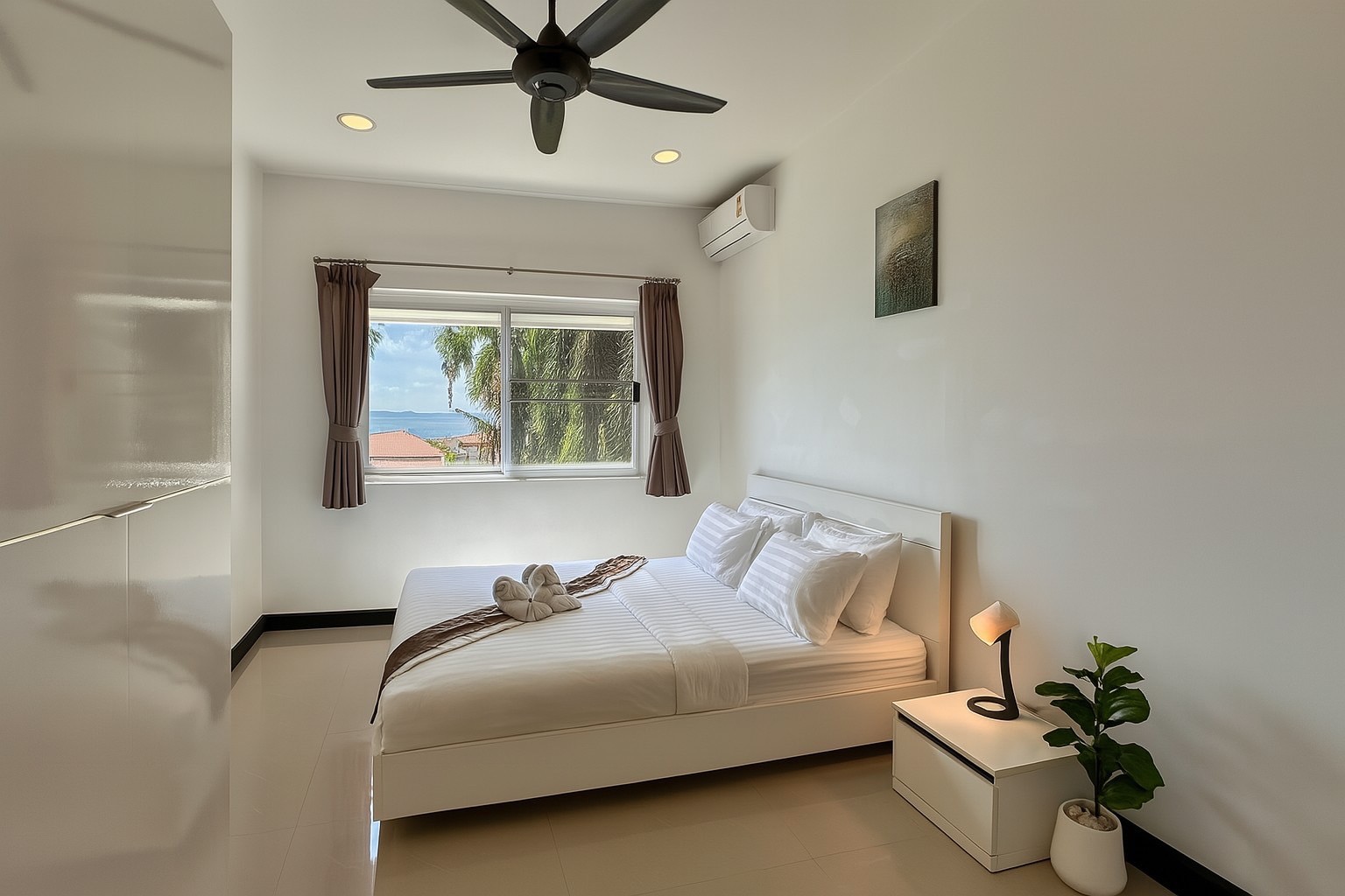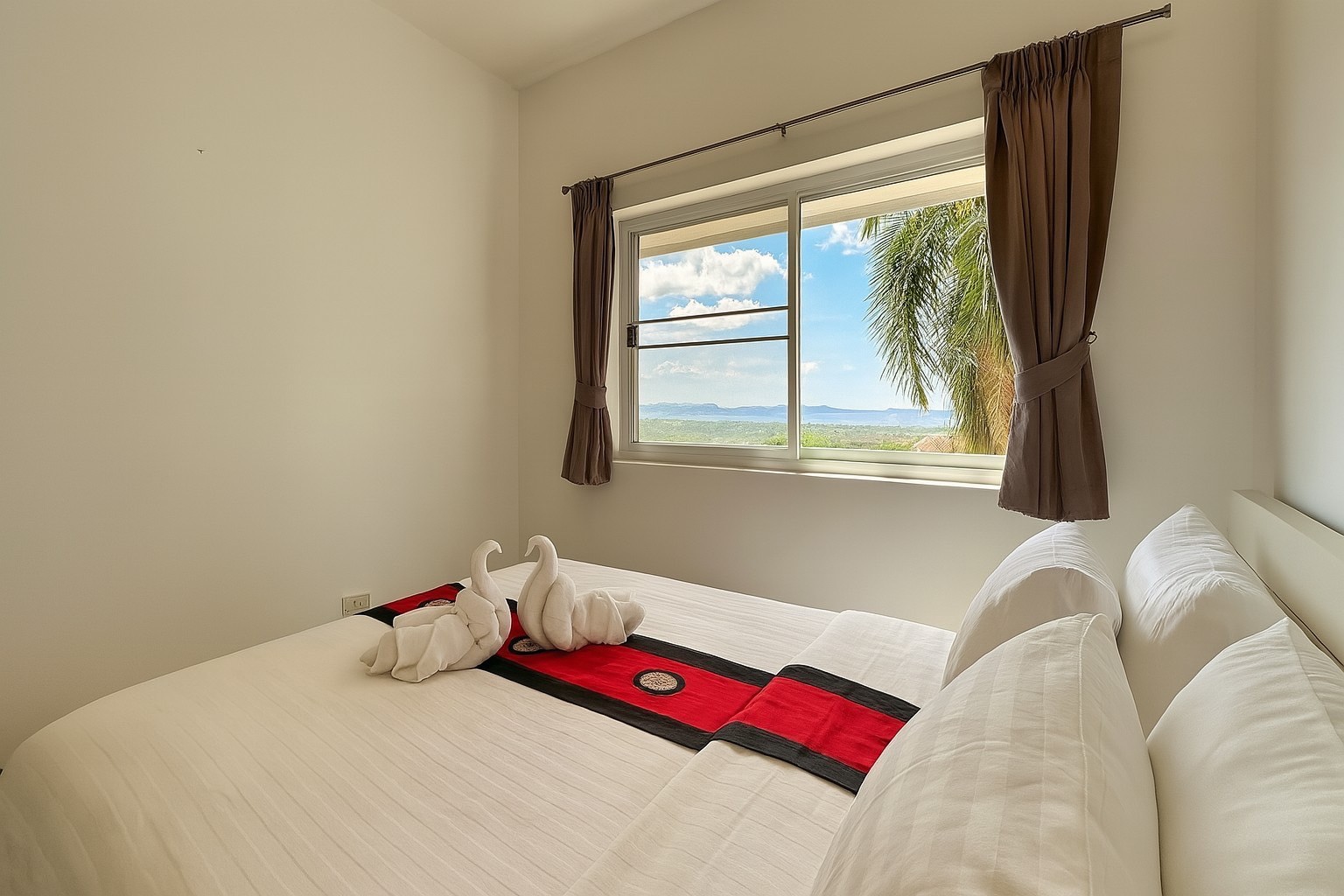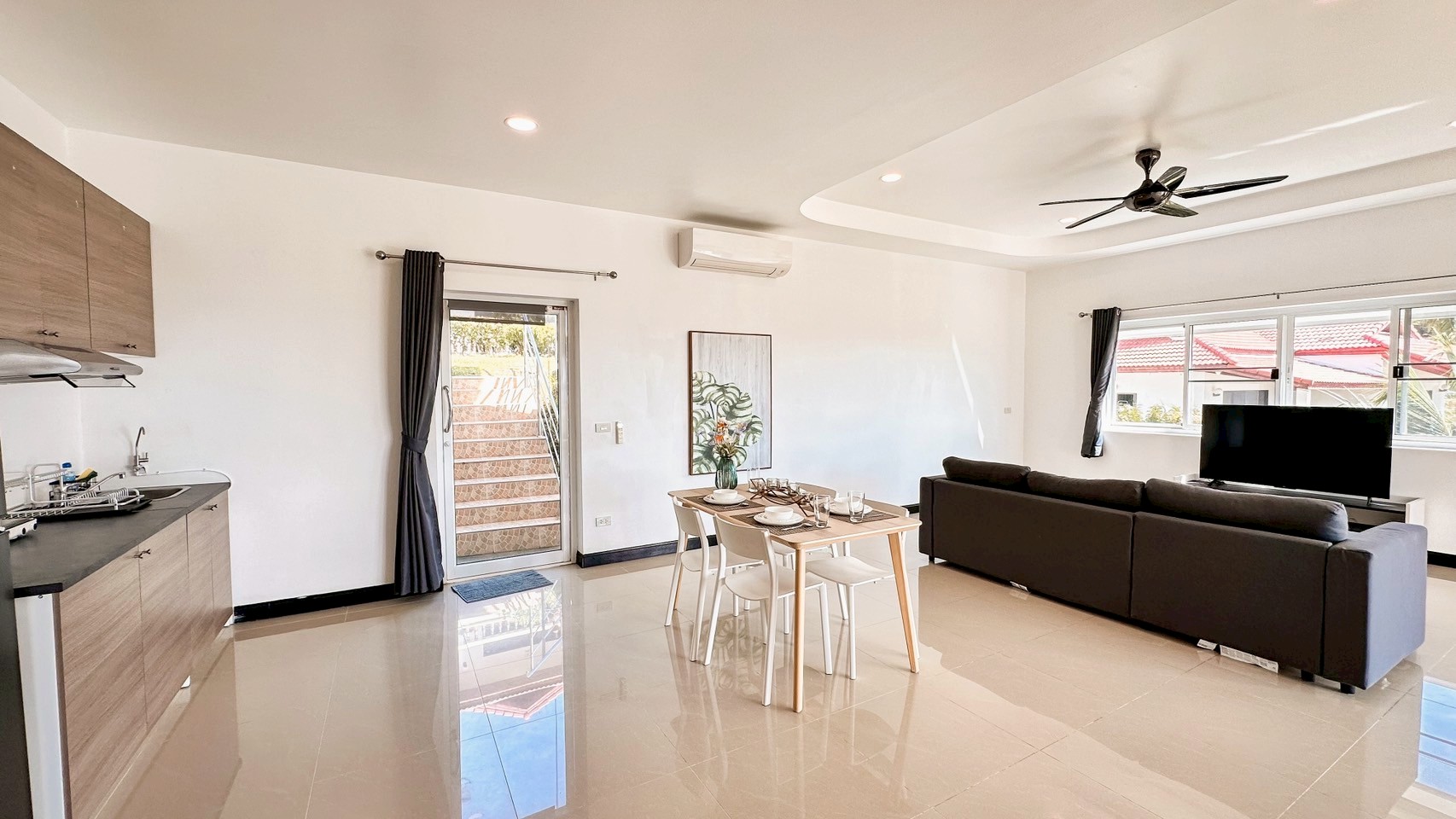 Experience luxury in a spacious 110-square-meter two-bedroom apartment on the first floor, sea views. This unit includes two bedrooms, a living room, and a bathroom. It also offers a dining table for four, a fully-equipped kitchen, and a private balcony off the living area, along with windows in both bedrooms for ample natural light.