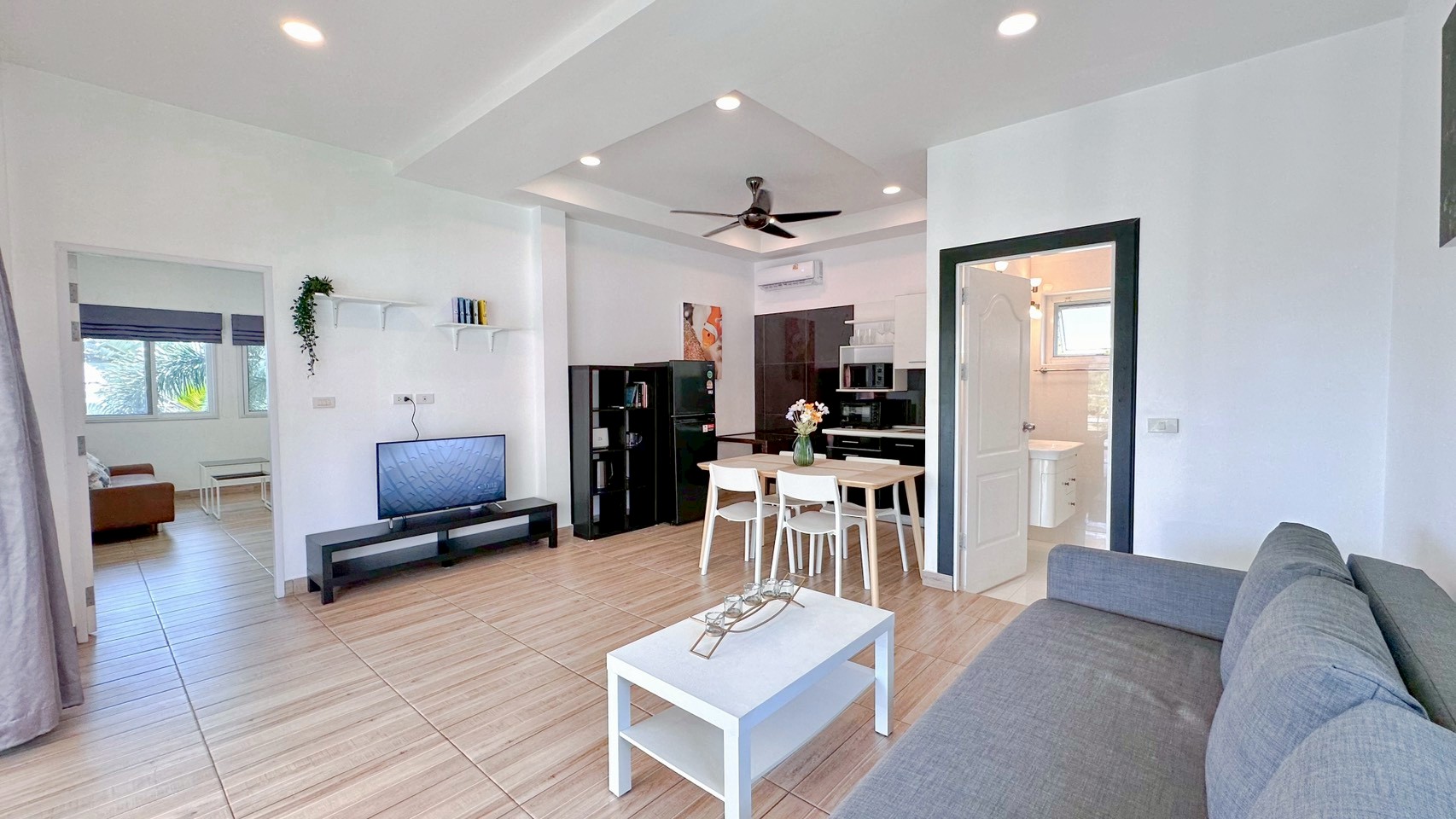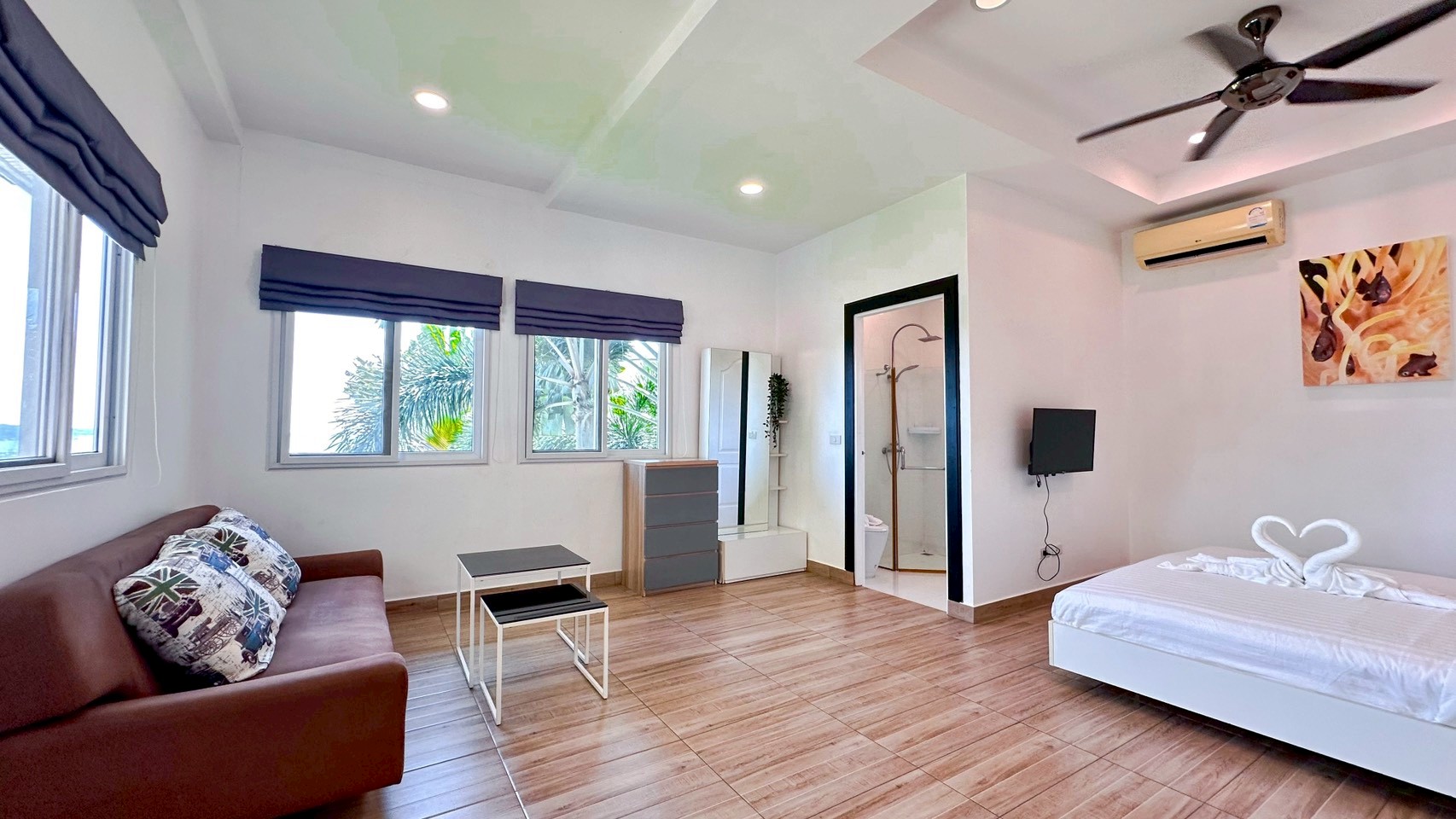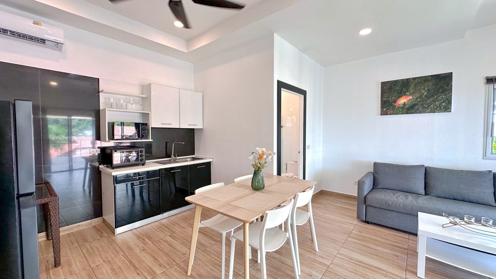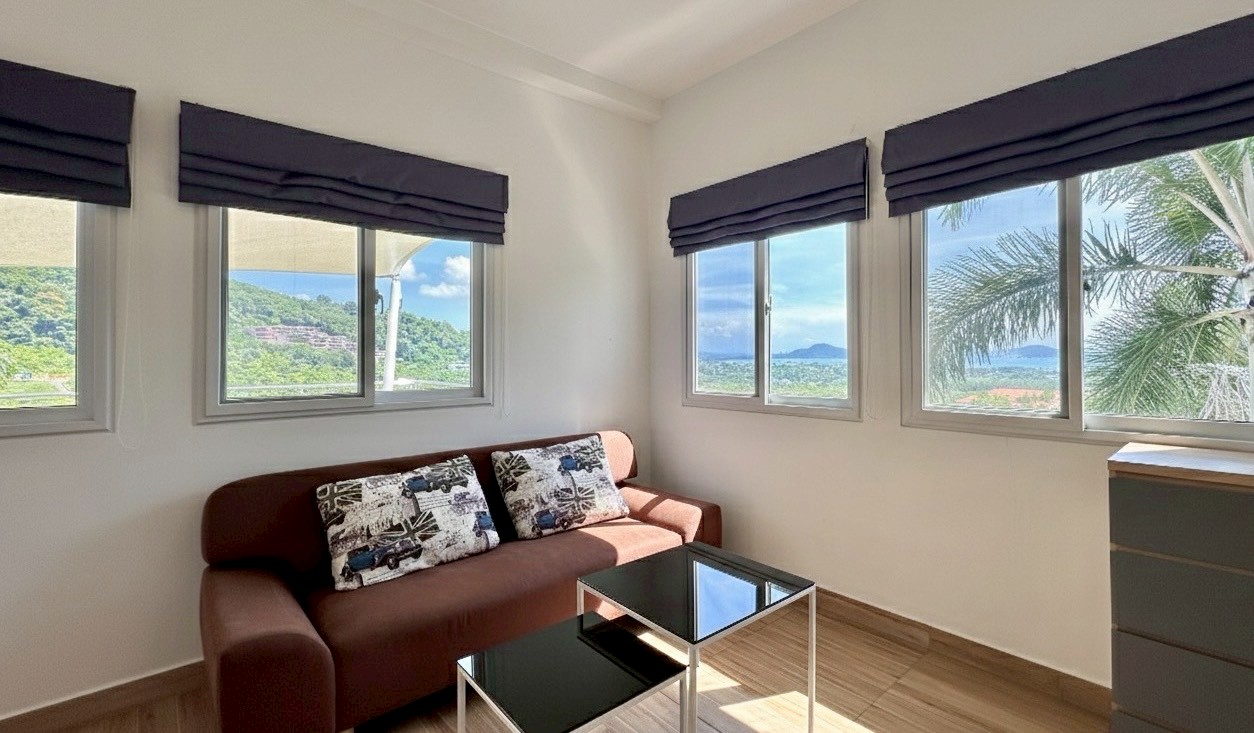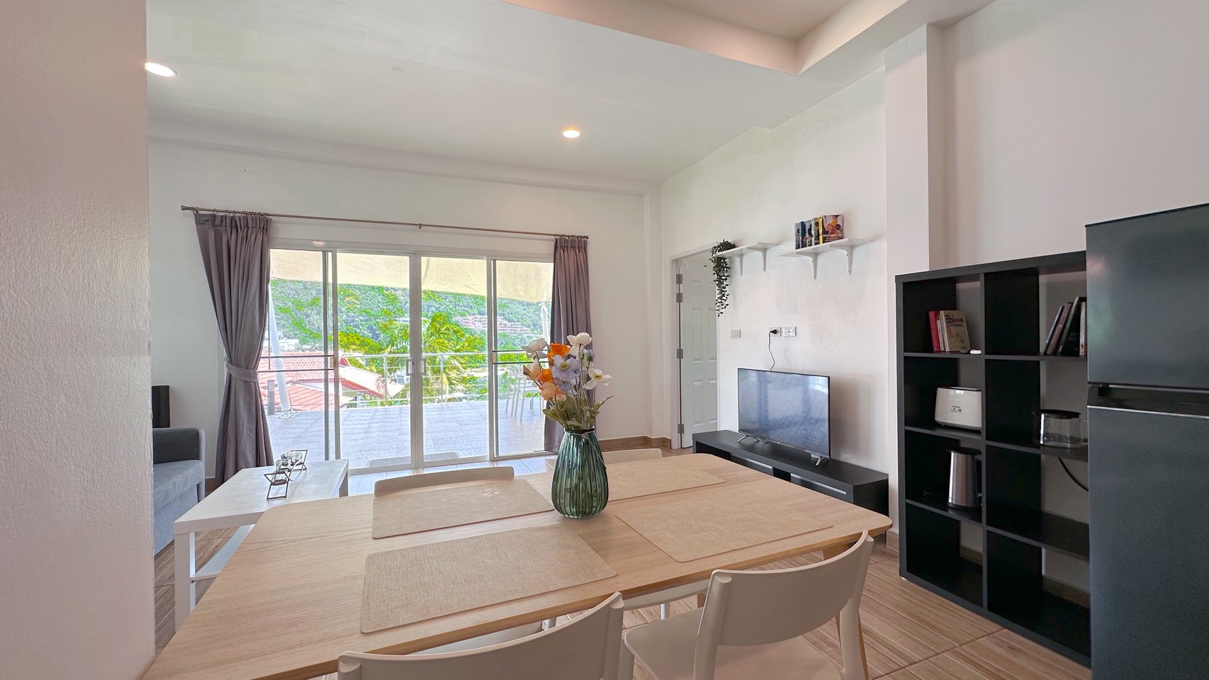 Experience the luxury of a 110-square-meter one-bedroom apartment on the second floor, boasting breathtaking 180-degree panoramic views of the mountains and sea. This unit features a separate bedroom and living room, two en-suite bathrooms, a dining table for four, and a fully-equipped kitchen. The apartment also offers an exceptionally spacious private balcony off the living area, making it perfect for couples or families seeking a serene and picturesque retreat.