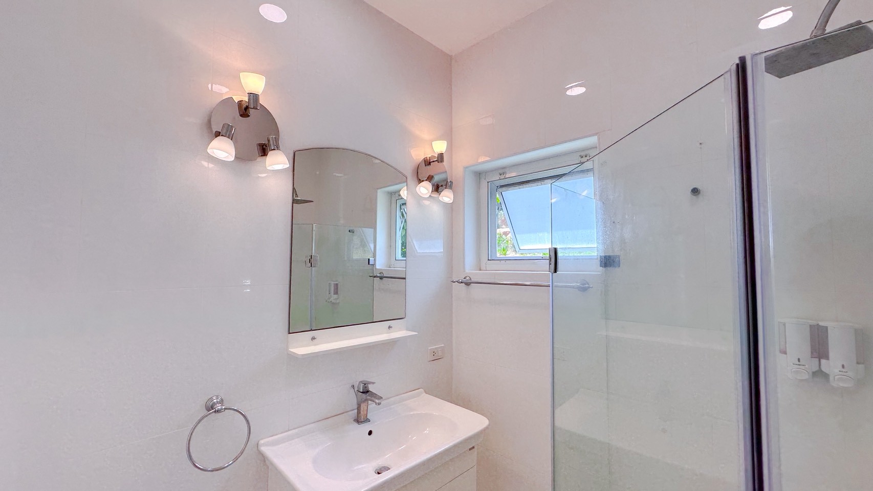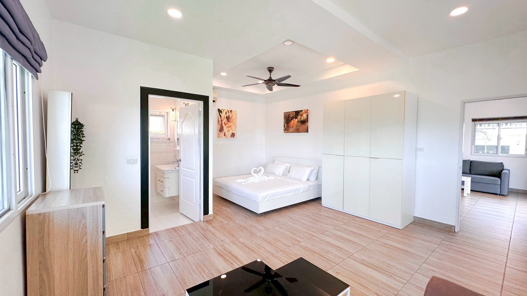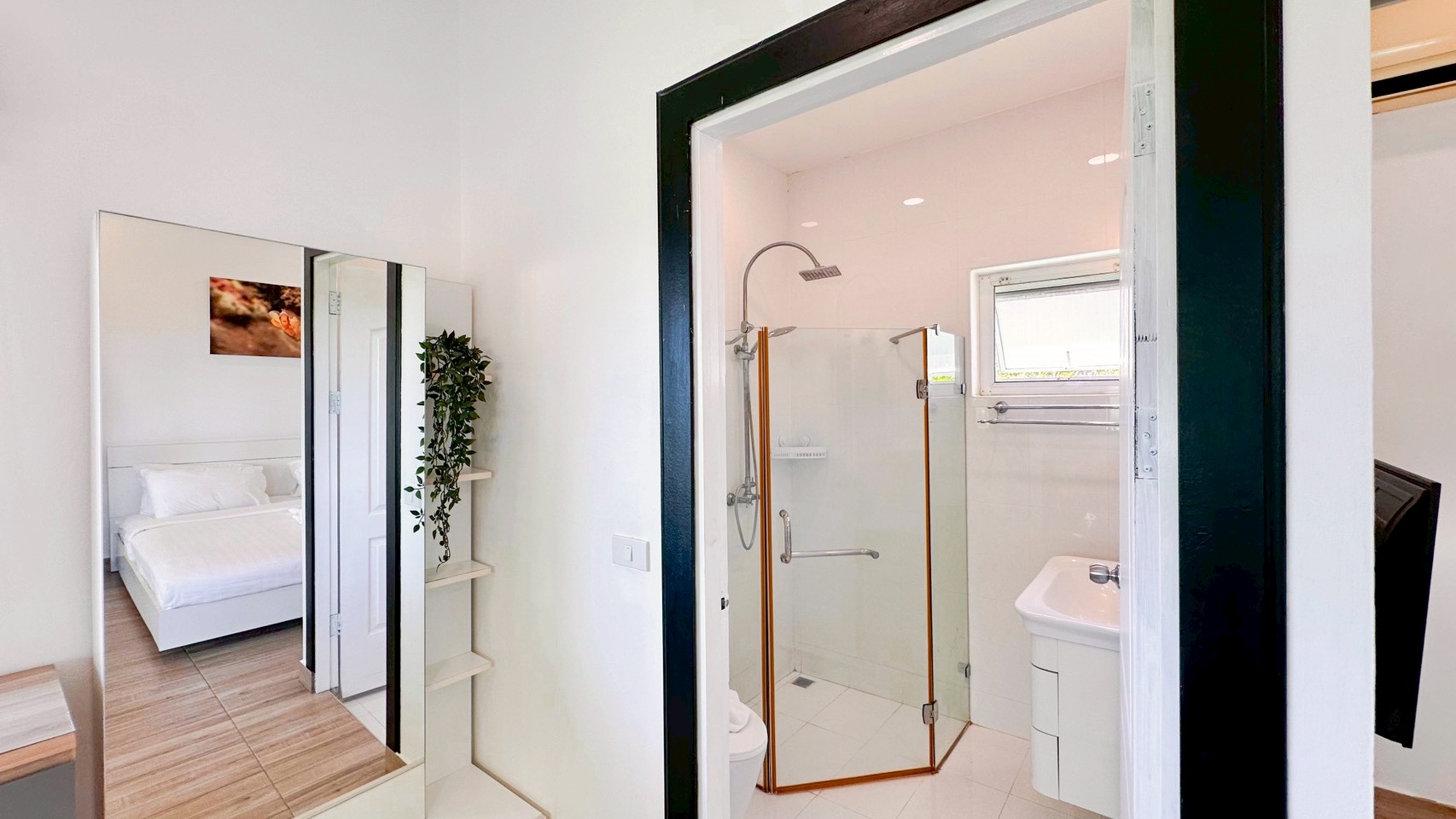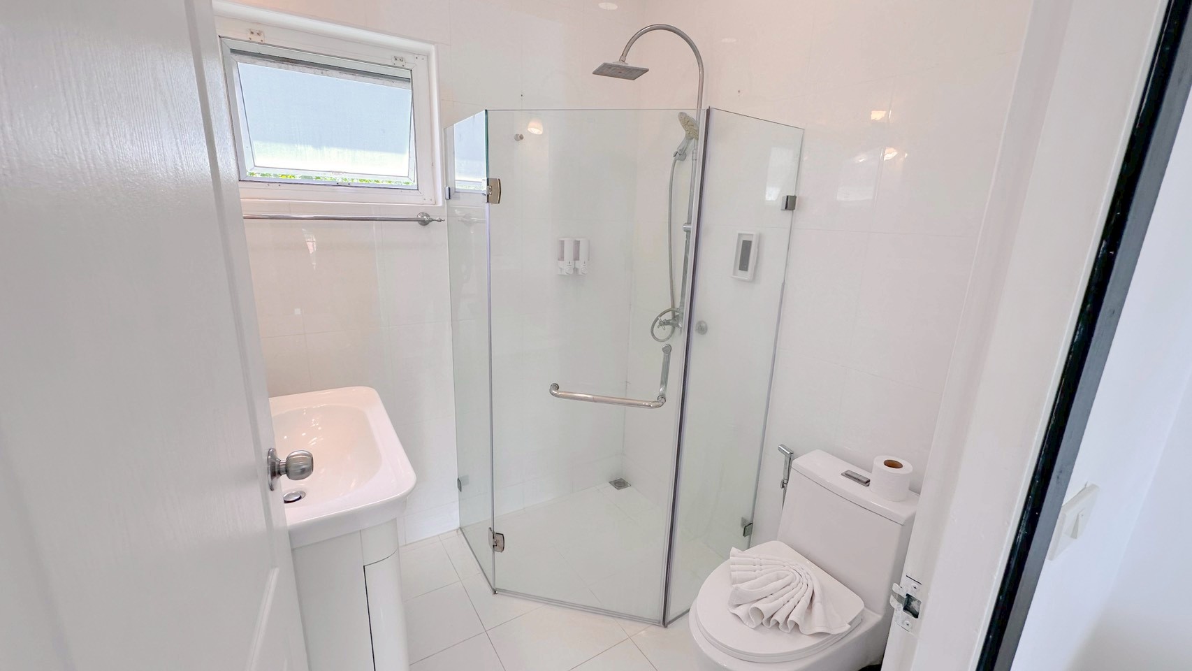 Experience the luxury of a 110-square-meter one-bedroom apartment on the second floor, boasting breathtaking 180-degree panoramic views of the mountains and sea. This unit features a separate bedroom and living room, two en-suite bathrooms, a dining table for four, and a fully-equipped kitchen. The apartment also offers an exceptionally spacious private balcony off the living area, making it perfect for couples or families seeking a serene and picturesque retreat.
